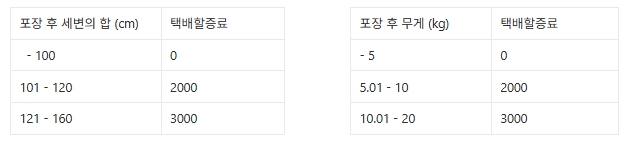- 부피, 무게운임 중 더 큰 금액으로 안내됩니다.